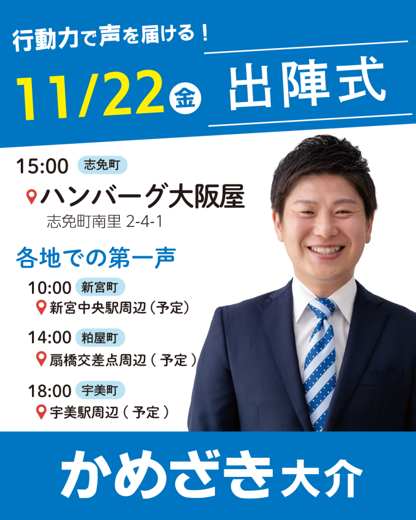 出陣式のお知らせ 2024年11月21日 かめざき大介出陣式のお知らせです。 ぜひご参加ください。 SNSも随時更新しています。 関連記事インスタグラムhttps://www.instagram.com/kamezaki_d/ 関連記事フェイスブックhttps://www.facebook.com/kamezakidaisuke 関連記事X(旧ツイッター)https://twitter.com/kamezakid