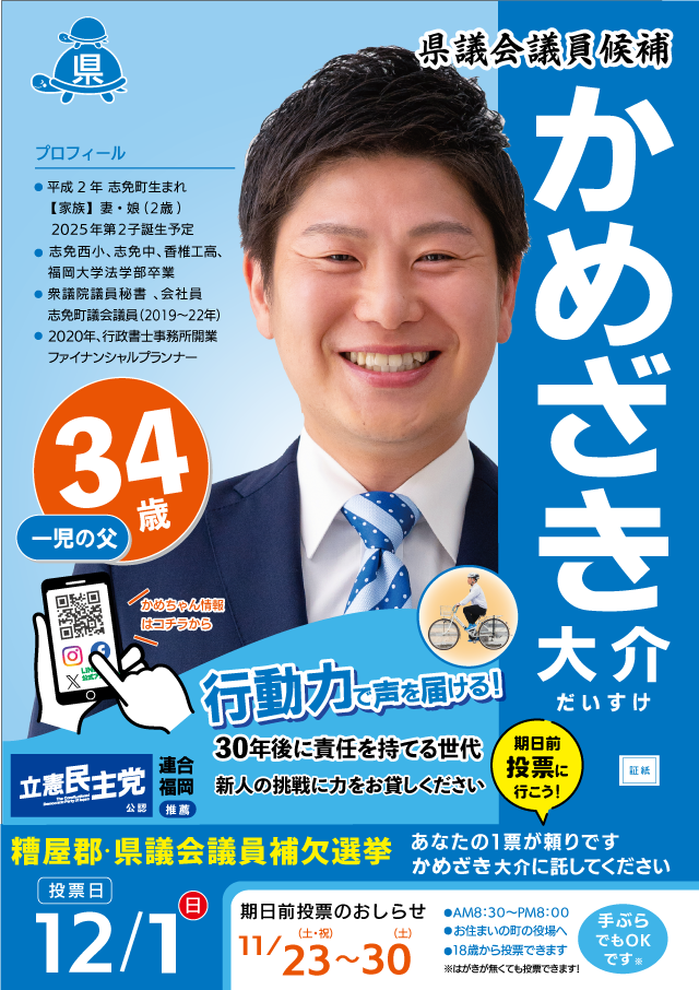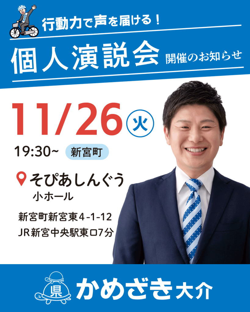 また、明日11月26日(火)は、新宮町で個人演説会を開催します。お近くの方、ぜひご参加ください。
